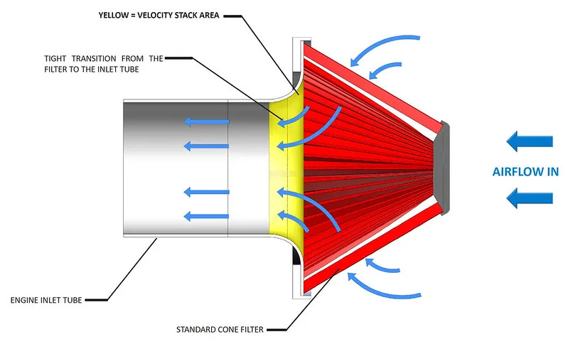 Most aftermarket intakes use a cone filter mated to an inlet tube with some type of heat shielding. In this configuration airflow must negotiate a path from the large diameter at the base of the filter through to the smaller diameter of the inlet tube in a relatively short distance. There is usually a velocity stack at the base of the filter to help with the transition, however the stack is usually small. This sudden transition in geometry is detrimental for flow. The result is a loss of throttle response and performance gains are usually limited over the OEM intake system. The diagram below shows a typical aftermarket intake using a cone filter secured to an engine inlet tube. The filter uses a standard velocity stack, which has been highlighted in yellow.
