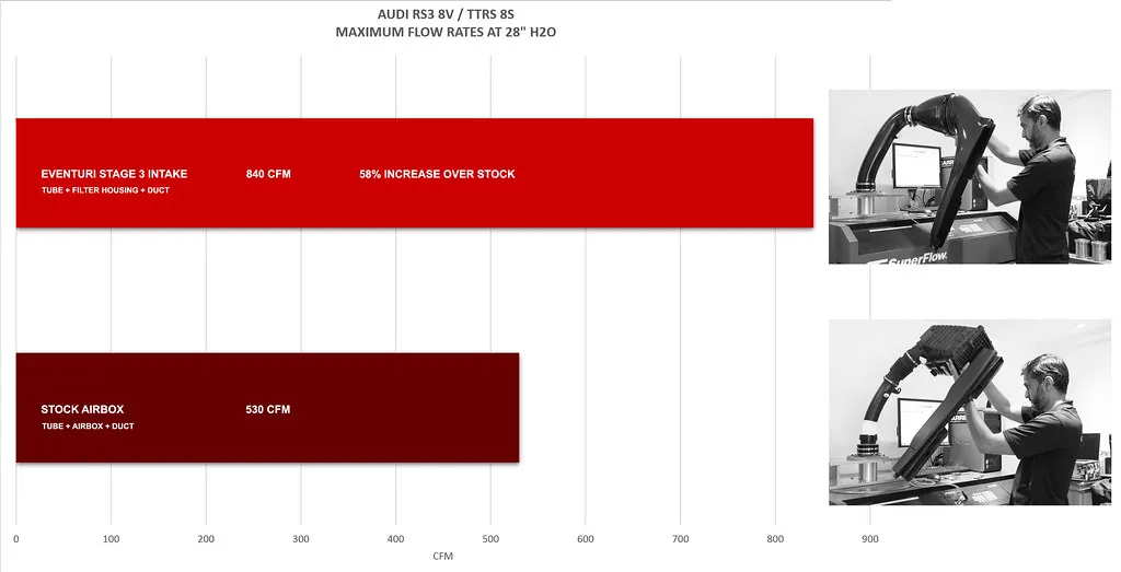 Flow Bench Data: Stock Intake 530 CFM : Eventuri Intake 840 CFM