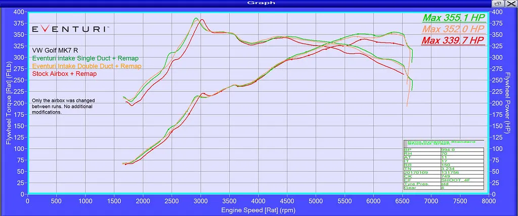 The following dyno graphs show the before and after results on a Golf 7 R (same engine as the Audi 8V S3) which already had a remap. So both the stock airbox and the Eventuri were tested with the same remap in place. All tests were carried out back to back on the same day with the BONNET CLOSED ON ALL OCCASIONS.