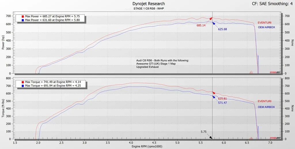 Dyno testing was carried out by Awesome GTI in the UK on their own C8 RS6 equipped with an aftermarket OPF back exhaust. They tested the car with the stock map and also their own stage 1 remap. They ran the car 4 times in 4th gear with the stock airbox and then swapped over to the Eventuri while the car remained on the dyno. The car was then run again in 4th gear 4 times. Testing was all done on the same day and no other changes were made. The graph below shows the highest power from the stock airbox vs highest power run from the Eventuri intake. Both were the first dyno pulls with subsequent pulls reducing in power due to heat soak. As can be seen below the intake provides a significant gain in performance throughout the RPM range with the stock map and more so with the stage 1 remap. The highlighted point shows the highest gain in the RPM range of 23hp at the wheels.