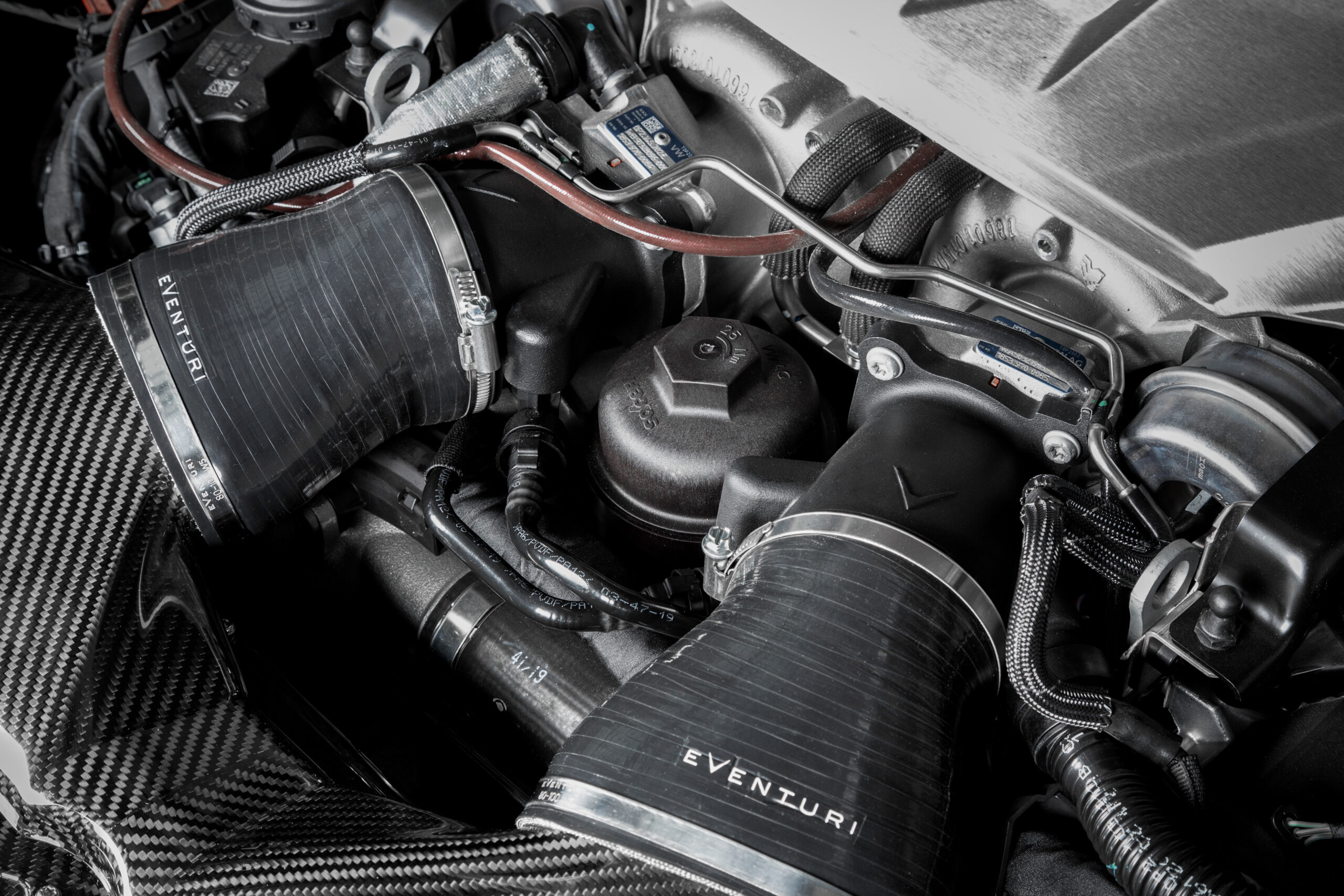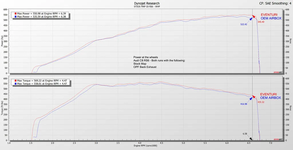 Dyno testing on a stage 2 RS6 was carried out by Eurocharged Canada on a car with aftermarket downpipes, intercoolers and their own stage 2 remap. Figures here are shown at the wheel. They ran the car multiple times with both the stock airbox and the Eventuri with the resulting figures shown below after taking the best stock vs the best Eventuri results. Again we can see a dramatic increase in power and since this is at stage 2 levels, the stock airbox is an even bigger restriction. The highlighted point shows the highest gain in the RPM range of 79hp at the wheels.