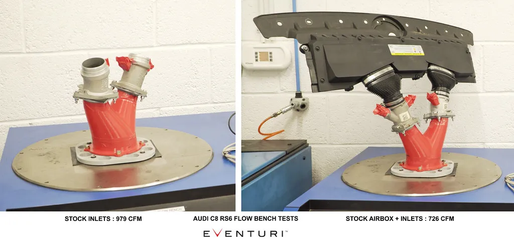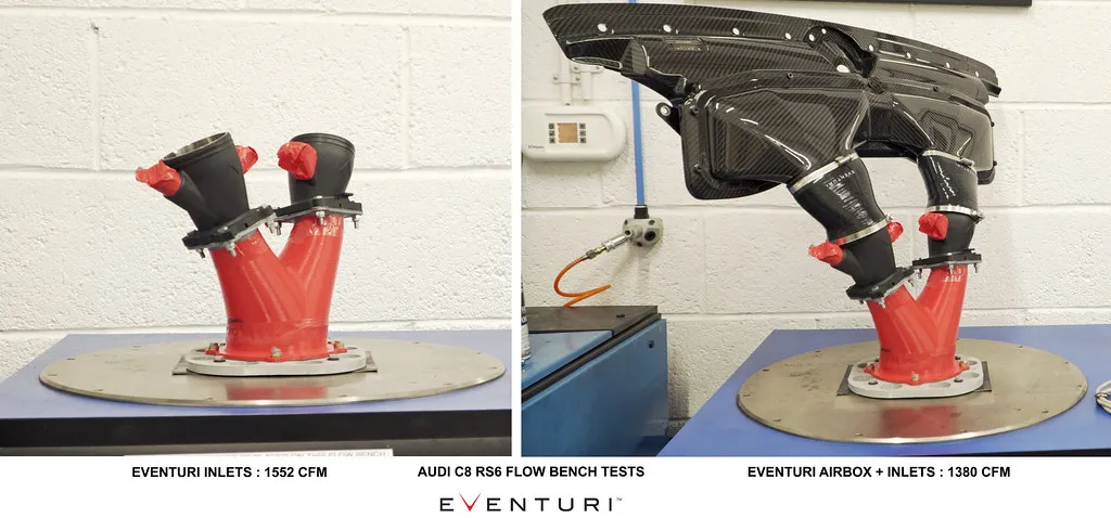 Testing just the inlets alone shows a 58% increase in flow rate over stock. This is due to the way our inlets increase in diameter at the airbox side which allows for a much lower restriction. Testing the complete system with the airbox shows an increase in flow rate of 90% over stock which is a significant increase. This shows just how restrictive the stock airbox is, with the flow rate dropping by over 25% when adding the stock airbox to the stock inlets. In contrast the flow rate drops by only 11% when adding the Eventuri intake to the Eventuri inlets. With a 90% increase in flow rate, it is clear why there are significant power gains once the C8 RS6 is tuned and the turbos demand a higher flow to create more boost pressure.