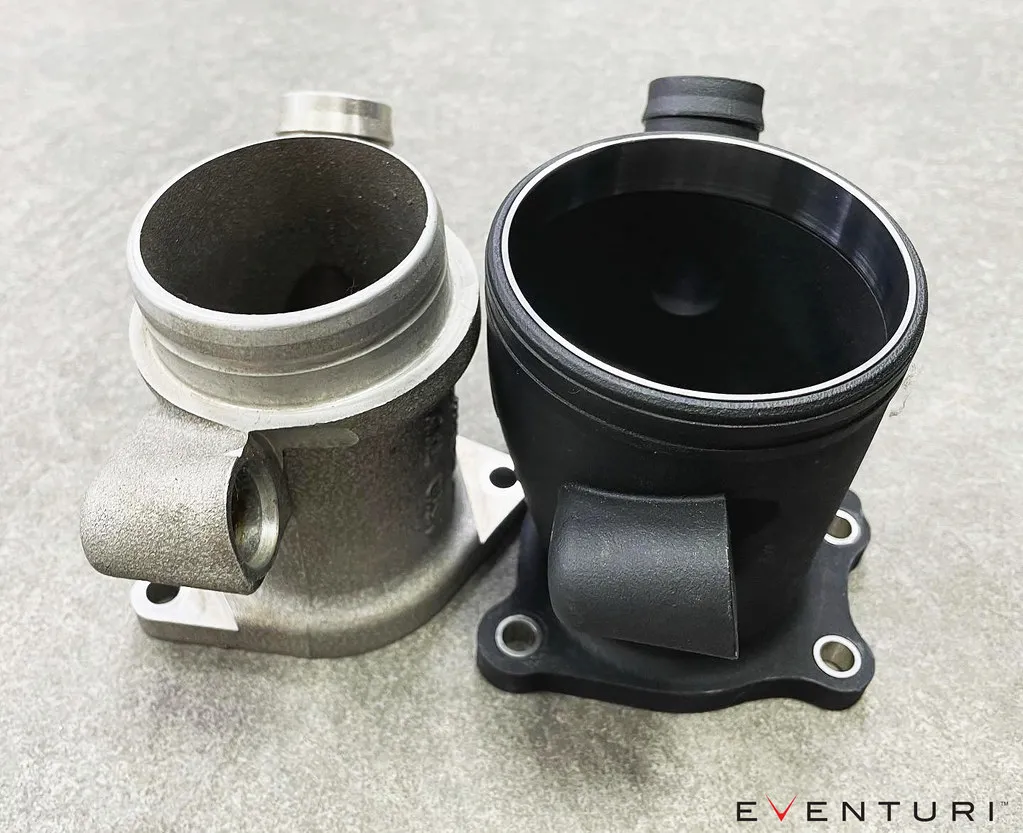 The inlets have been increased in size at the airbox side by as much as 85% more than the stock inlets and smoothly taper down to the stock turbos. This increased size significantly reduces the drag in the turbos and therefore allows them to work more efficiently. We have also incorporated CNC machined bushes and rings in the inlets for structural strength. For cars with hybrid turbos, we also have separate inlets available on request to match the different inlet diameters.