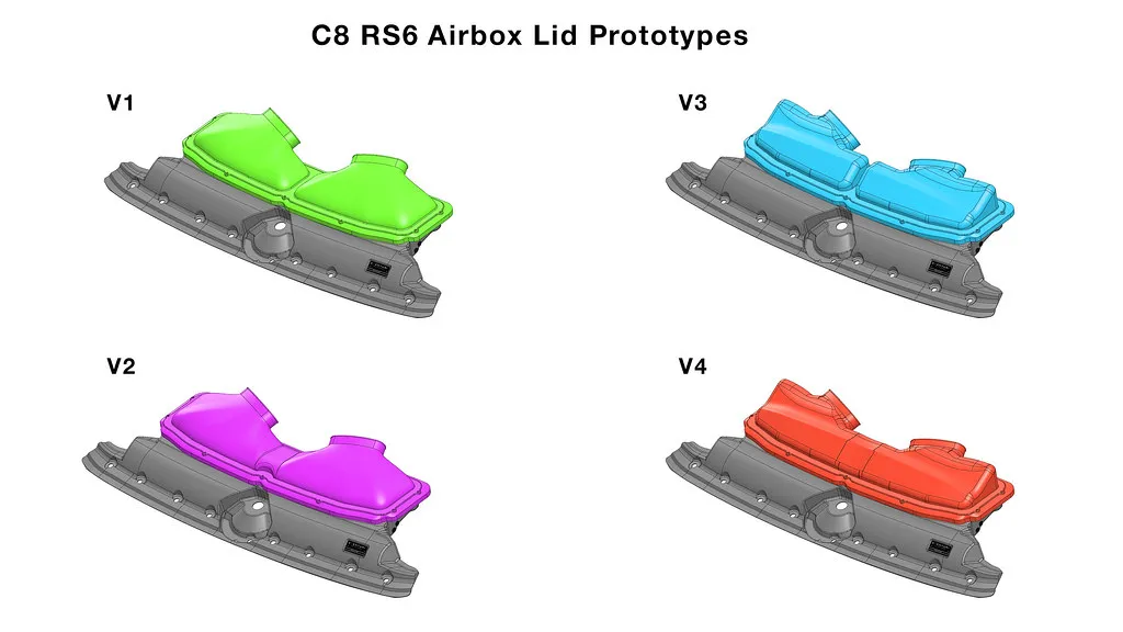During development we designed and tested 4 different designs for the lid and test results showed that V2 was the highest performing. This design was optimised with CFD simulations and provides a smooth flow path from the filter to the inlets. Our design has an increased volume in comparison to the stock lid and is more organically shaped with smoother curves as opposed to the stock lid which is very cuboid. Furthermore the openings to the turbo inlets have been significantly increased in size.