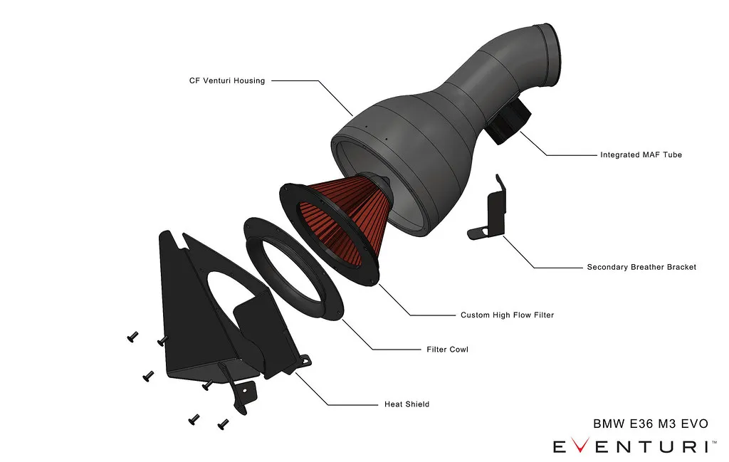 The Eventuri E36 M3 intake system consists of a number of components engineered to perform a specific purpose and fabricated to the highest of standards. Here are the details for each component and the design ethos behind them:
