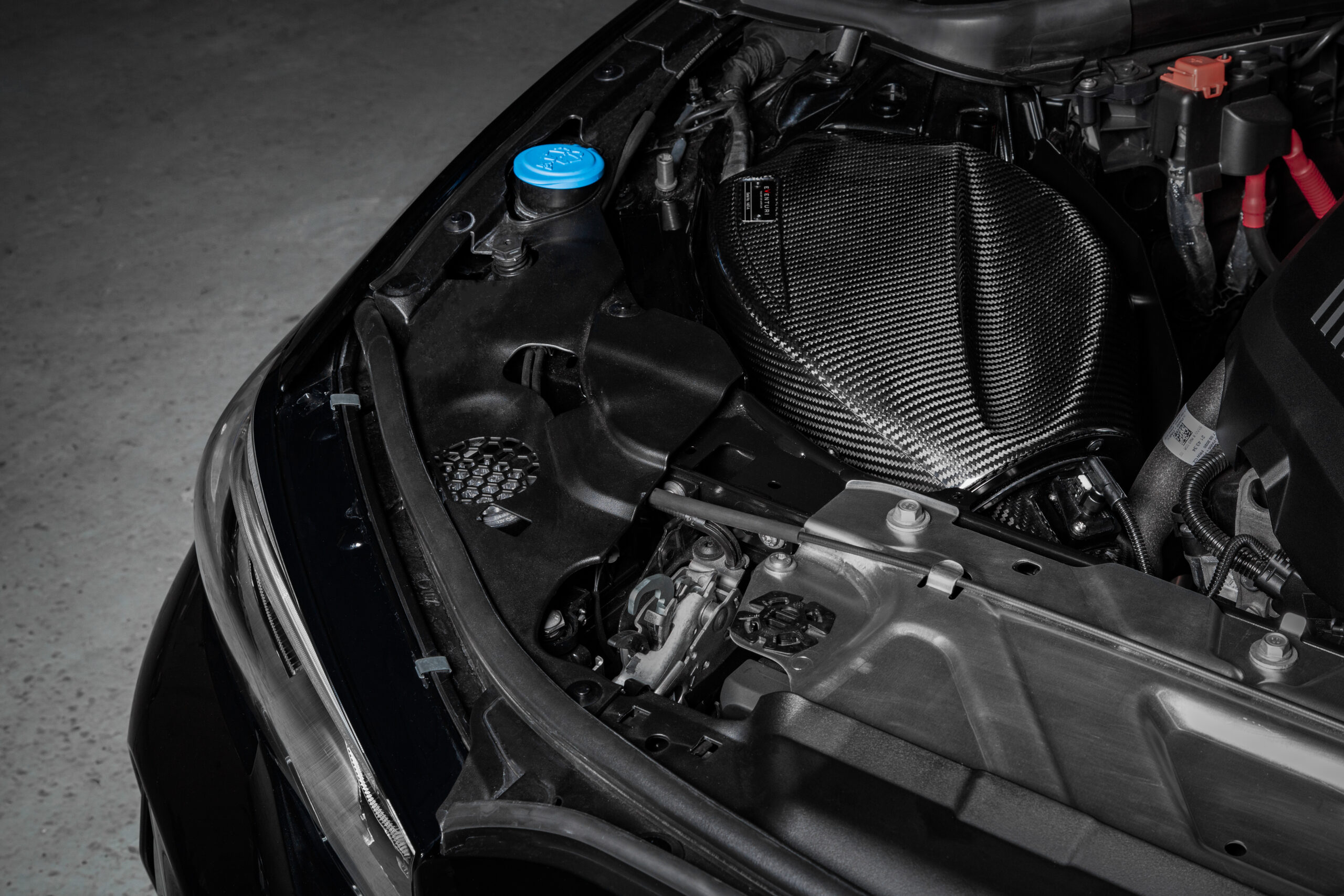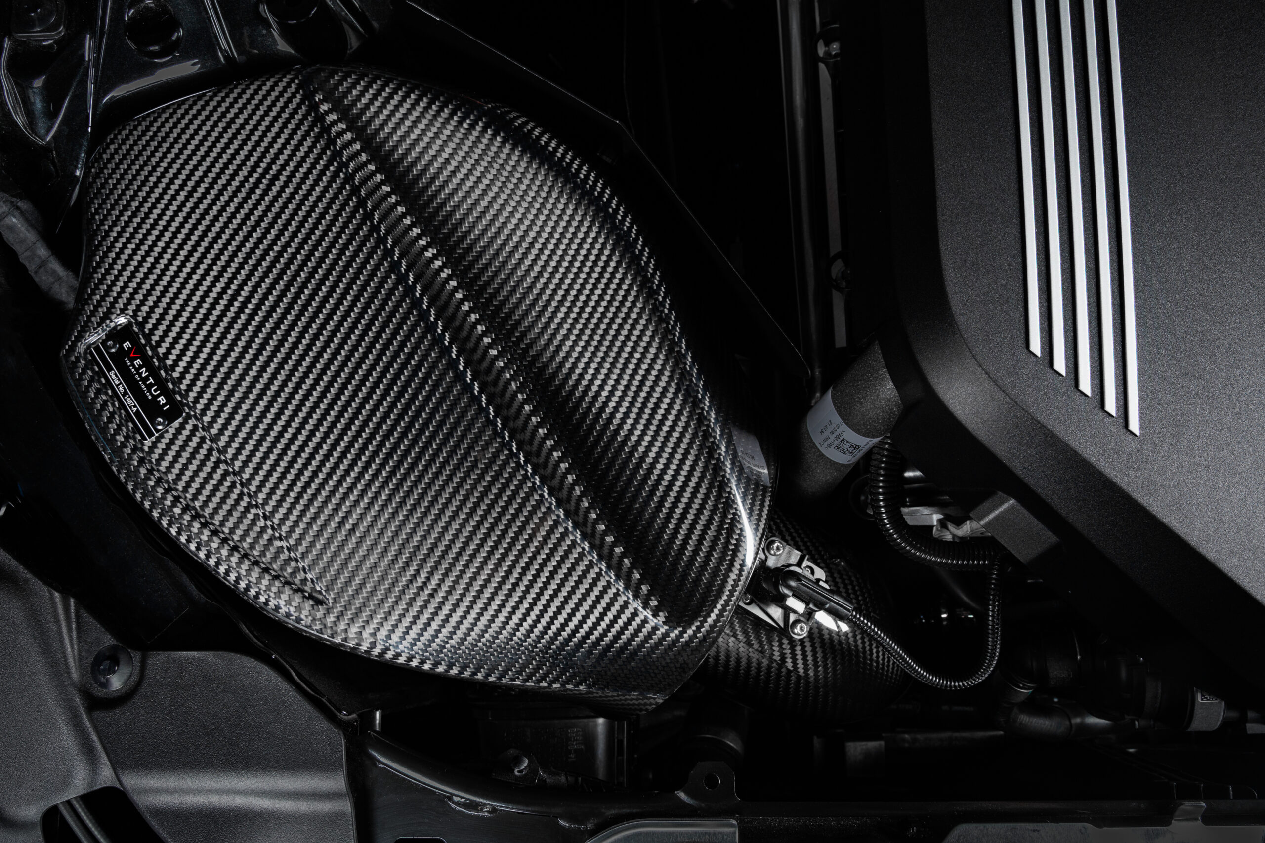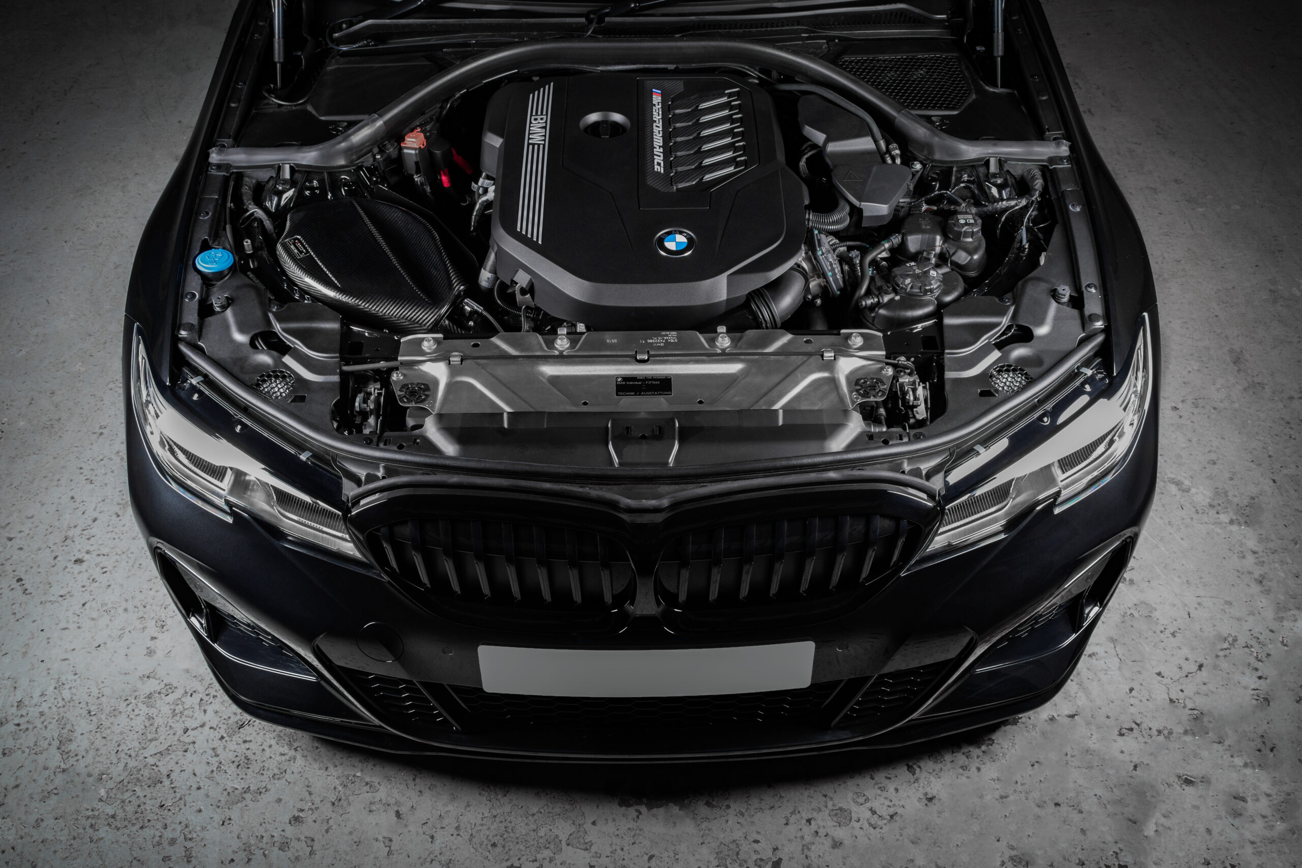 The BMW G20 B58 Eventuri intake has been developed to provide the turbo with a less restrictive flow path whilst maintaining low inlet temperatures. Heat and Volume are the main considerations when designing an intake for turbocharged engines. In the G20, the intake system is located next to the exhaust manifold which rapidly heat soaks the engine bay. High temperatures are detrimental for engine performance as the turbo would have to build boost with heated, less dense air and so the only way to ensure IAT’s are kept to a minimum is for a fully sealed intake. This however, results in a restriction with only one stock air feed to draw air in from. During development we noticed an additional opening into the wheel arch area and took advantage of this by adding a secondary feed to our airbox. Furthermore our sealed airbox also has a heat shield with gold reflective to minimise the radiative heat transfer from the exhaust manifold. In order to maximise volume we made the airbox as large as possible with a recess for potential strut braces. The stock convoluted intake tube is replaced with a smooth carbon tube which is also larger in internal volume with a starting internal diameter of 111mm (4.4″) smoothly tapering down to match the turbo inlet. The tube provides a smooth path from the filter to the turbo inlet. Finally we use a custom made high-flow dry filter which is ISO tested for filtration performance and has a larger filtration area than the stock filter.