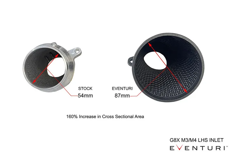 The G8X M3/M4 Eventuri system uses our Patented Carbon Fiber Housings with our Gen 2 bespoke filters, which provide an aerodynamically efficient airflow path from the filter to the turbos. Not just another cone filter with a heat shield but a unique design which invokes the Venturi effect and maintains laminar flow conditions to reduce the drag on the turbo. You can read more about the housing design and how it works HERE.
