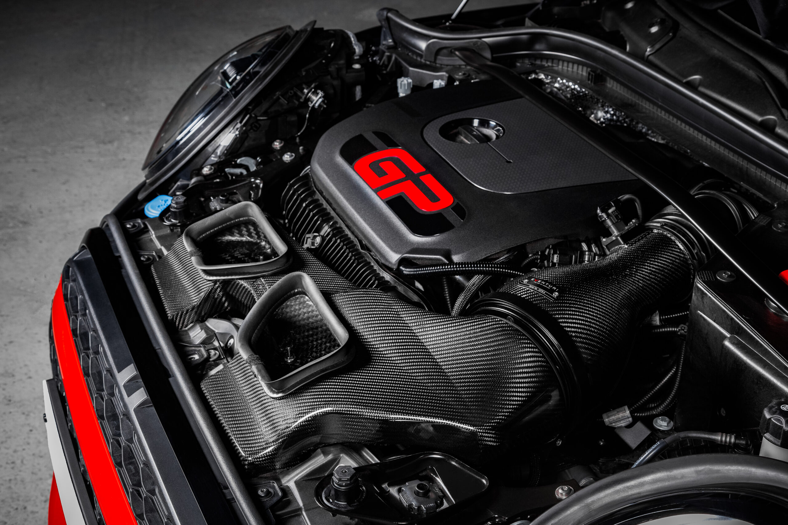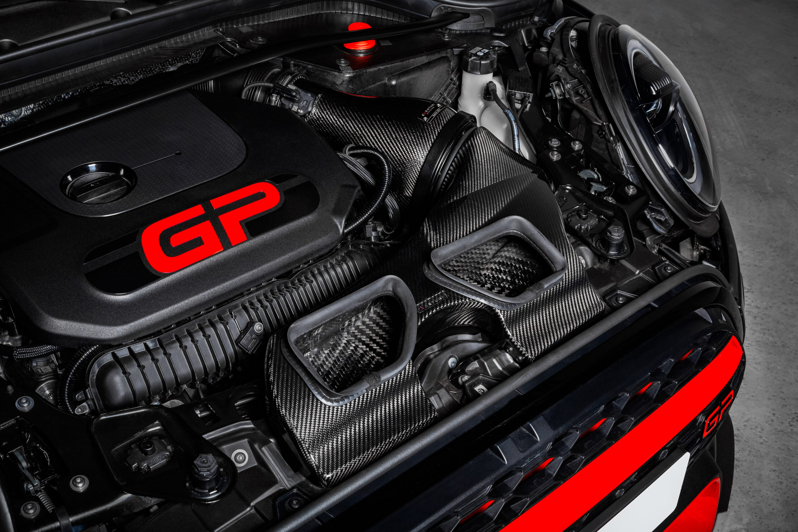 The F5X JCW Eventuri intake system is a perfect example of our “Complete System” principal. It is a sealed system which ensures that the turbo does not draw hot air from the engine bay but enhanced with a functional bonnet scoop which forces ambient air into the intake duct. This duct has a larger internal volume than the stock version and also draws air from the stock location above the radiator. The combination of a sealed system with an air scoop results in lower intake temperatures than the stock airbox and avoids heat soak which is a common issue especially on higher powered MINIs. To ensure the smoothest flow possible we use our Patented Venturi filter housing which has an integrated MAF section for a seamless flow path to the turbo.