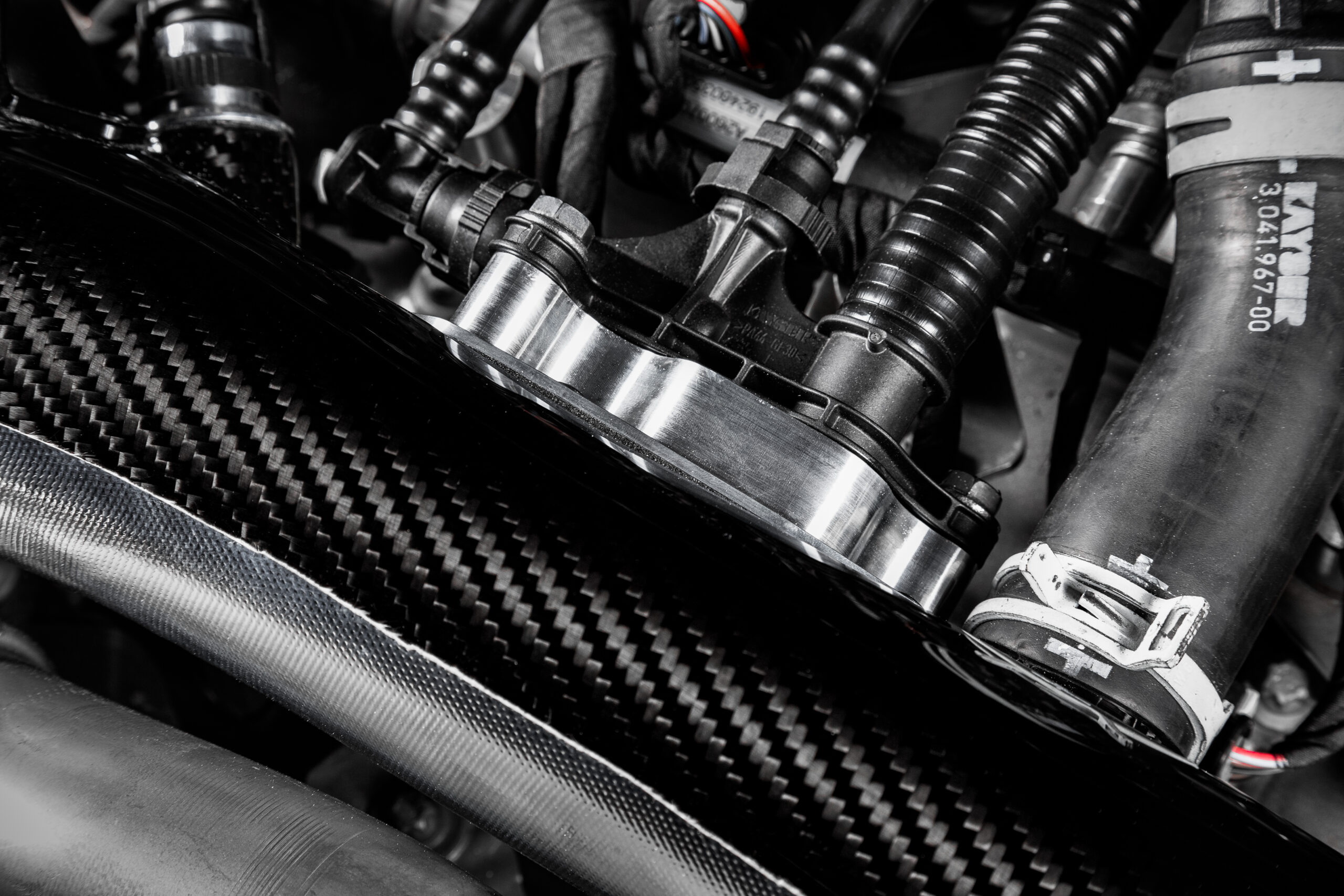 The Mercedes A35 Eventuri Turbo Tube has been developed to provide the turbo with a less restrictive flow path as compared to the stock tube. We have managed to increase the internal volume as well as eliminating the ridged flexible section at the airbox side. By using a completely solid tube all the way from the intake to the turbo, the flow path is smoother and therefore airflow can remain more laminar. To account for engine movement, our A35 intake has a “floating” tube, which can move within the airbox. The shape of the carbon tube at the turbo end has been optimised using CFD to minimise turbulence. The connection to the turbo is achieved with an innovative silicon coupler that features an internal thermal separator between the carbon tube and the metal turbo housing. The multiple breather connectors at the back of the tube are taken care of with a CNC machined block which also provides a smooth internal surface for airflow within the tube.
